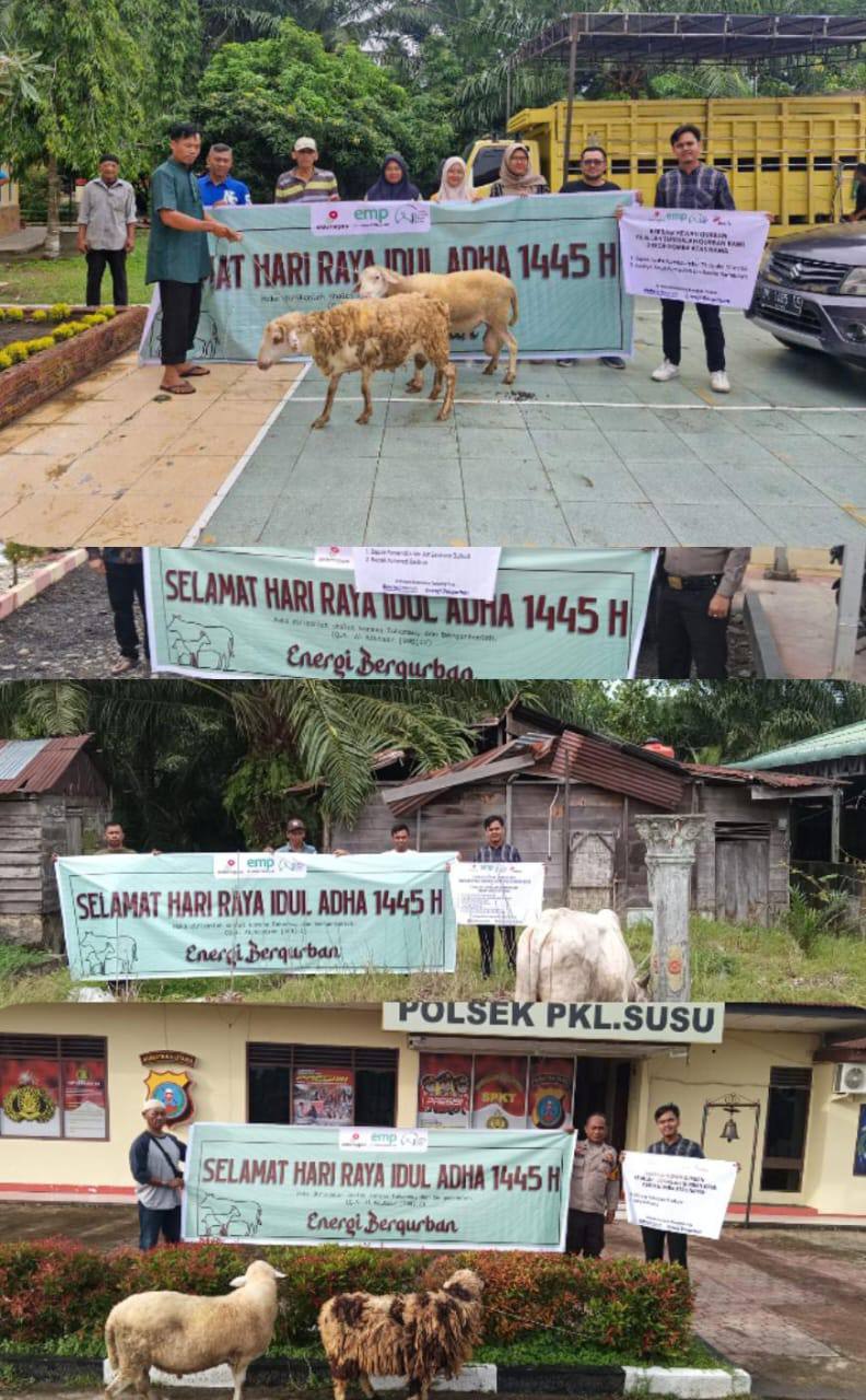 “Dalan rangka merayakan hari Raya Idul Adha 1445 H/2024 M,Simpatisan dari PT.EMP (Energi Mega Persada) dan PT. CEP (Catur Elang Perkasa) menyerahkan hewan qurban,6 ekor sapi dan 8 ekor kambing domba dengan membagikan kepada 4 Desa dikawasan Kecamatan Tanjung Pura.juga Jajaran Kepolisian Polsek Tanjung Pura, Polsek Pangkalan Susu dan Polres Langkat.