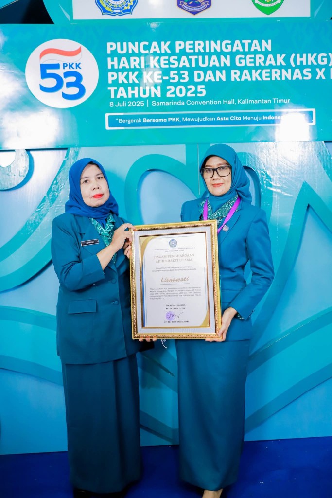 Dalam perhelatan puncak Peringatan Hari Kesatuan Gerak PKK ke 53 Tahun 2025 di Samarinda, Kalimantan Timur hari ini, salah seorang kader PKK Aceh Tamiang atas nama Lisnawati yang berasal dari Kecamatan Rantau memperoleh Penghargaan Adhi Bhakti Utama dan pin Emas PKK yang diserahkan secara langsung oleh istri Wakil Presiden, Selvi Gibran Rakabuming. Lisna memperoleh penghargaan tersebut atas komitmen dan dedikasinya mengabdi sebagai kader selama 25 tahun lebih. (H.Lubis)