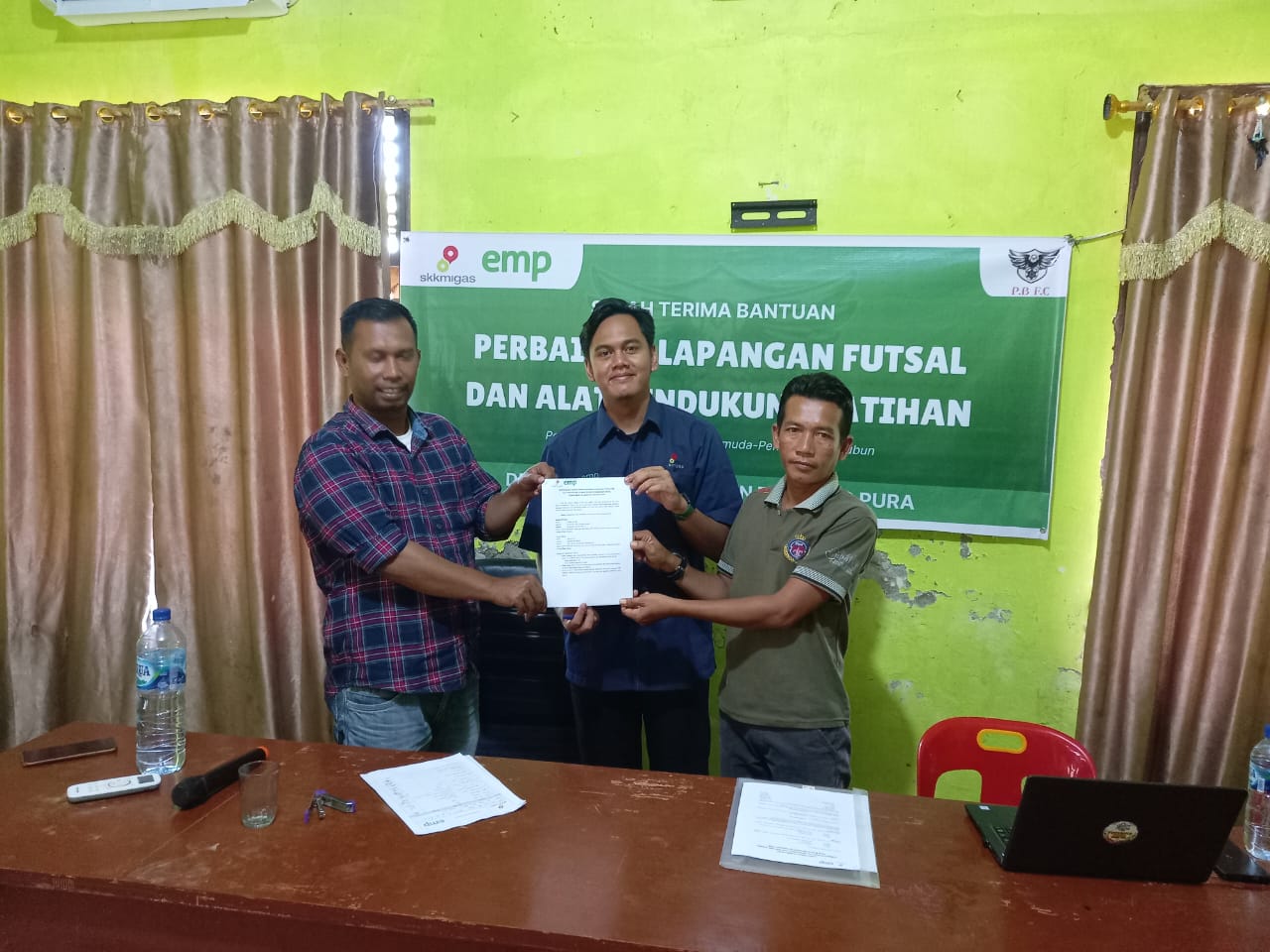 Berlokasi di Aula Desa Bubun, Kecamatan Tanjung Pura, EMP Gebang melaksanakan kegiatan serah terima bantuan perbaikan lapangan futsal dan memberikan perlengkapan untuk latihan olah raga kepada masyarakat pesisir wilayah Tanjung Pura, Kabupaten Langkat Sumatera Utara, Kamis 24 Juli 2025.