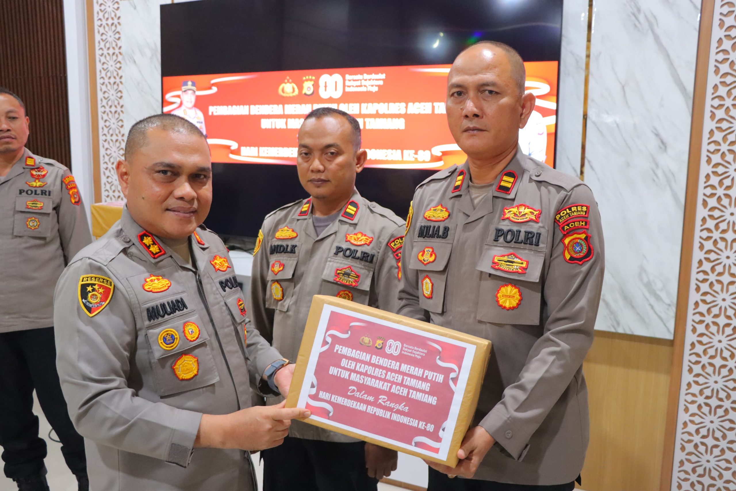 Pembagian Bendera Merah Putih yang di serahkan kepada seluruh Kapolsek jajaran polres aceh tamiang ini nantinya akan dibagikan langsung kepada masyarakat disetiap kecamatan untuk dikibarkan di depan rumah masing-masing dan kendaraannya.