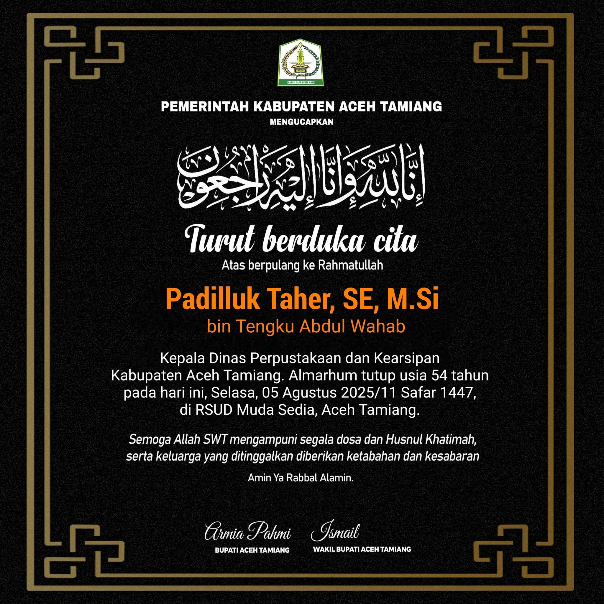 Diketahui, almarhum Padilluk Taher dilantik sebagai Kepala Dinas Perpustakaan dan Kearsipan pada 27 Desember 2022, berdasarkan Surat Keputusan Bupati Aceh Tamiang dalam rangka mutasi dan promosi pejabat eselon II.