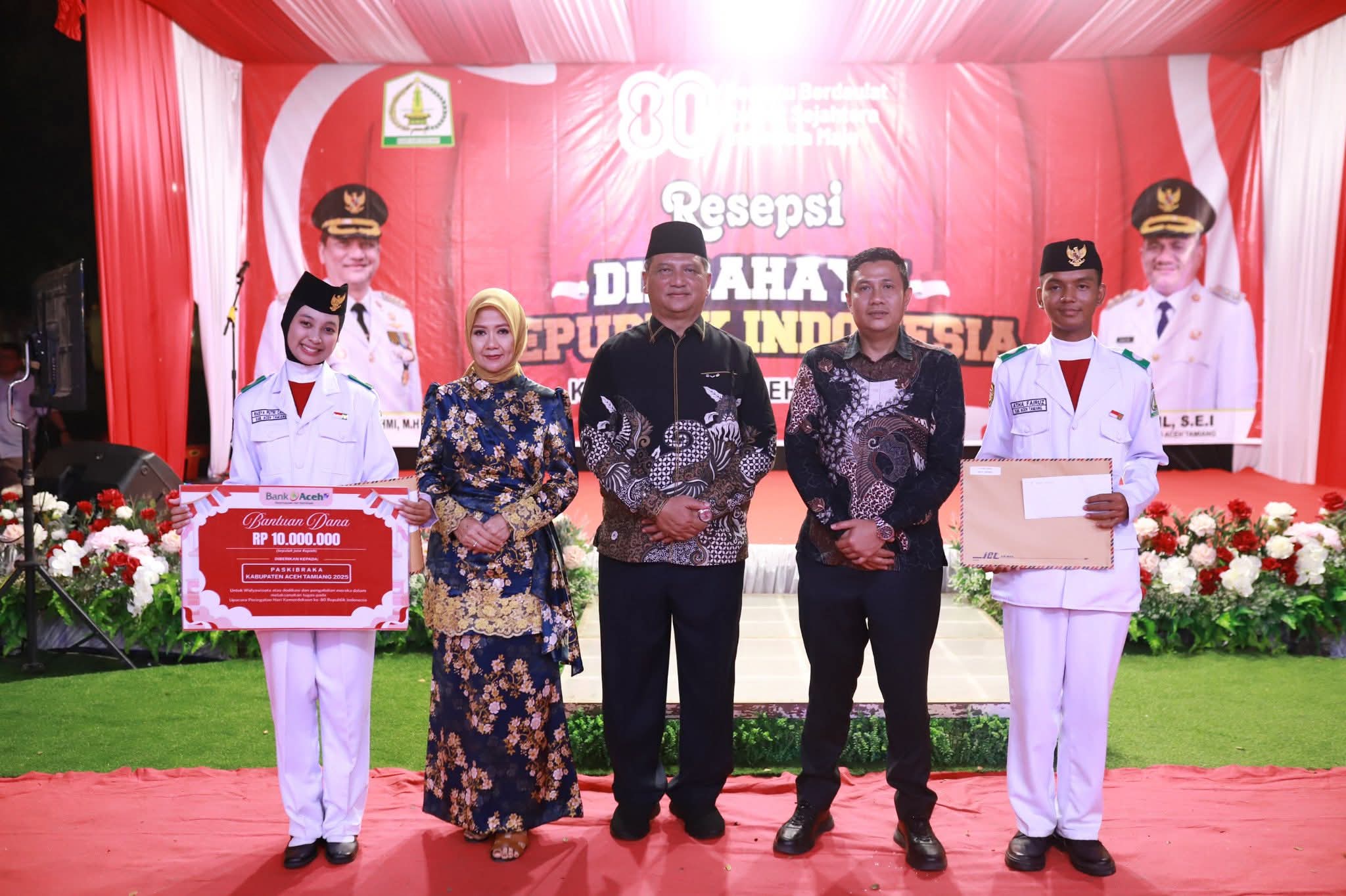 Sebagai bentuk apresiasi, Bupati Aceh Tamiang bersama Ketua TP-PKK, Ny. Yuyun Armia, menyerahkan sertifikat dan uang pembinaan kepada anggota Paskibraka Aceh Tamiang atas dedikasi mereka dalam menjalankan tugas pengibaran bendera merah putih pada upacara HUT RI ke-80. Kegiatan dilanjutkan dengan penyerahan bantuan dana Widya wisata dari Bank Aceh kepada PASKIBRAKA, sebagai bentuk dukungan dan motivasi bagi generasi penerus bangsa.
