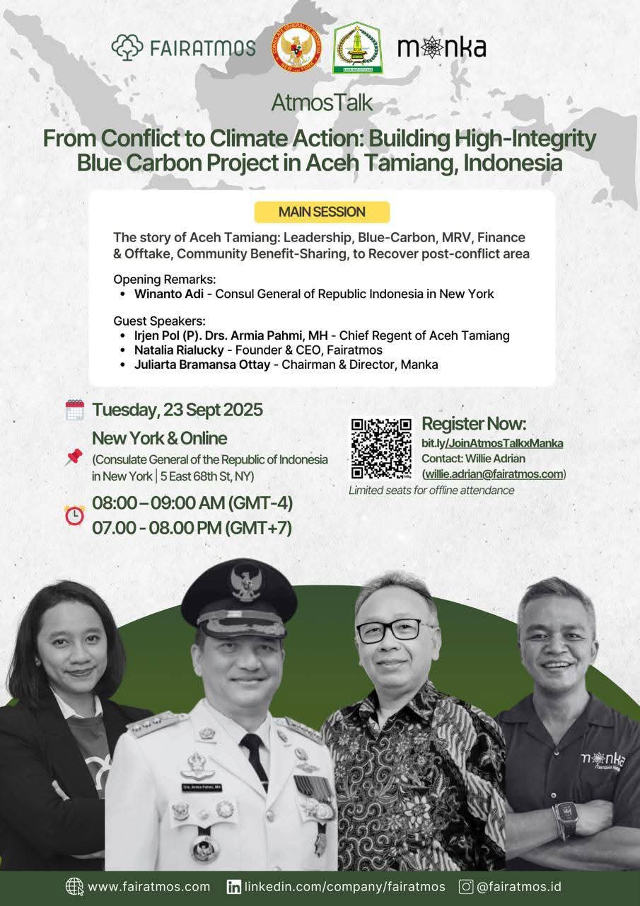 Sementara itu, Founder & CEO Fairatmos, Natalia Rialucky, serta Chairman & Director Manka, Juliarta Bramansa Ottay, selaku inisiator kegiatan turut memperkuat paparan Bupati Armia. Mereka menjelaskan proyek ini dilengkapi mekanisme MRV, skema pembiayaan & offtake, serta pembagian manfaat yang memastikan keterlibatan masyarakat lokal.
